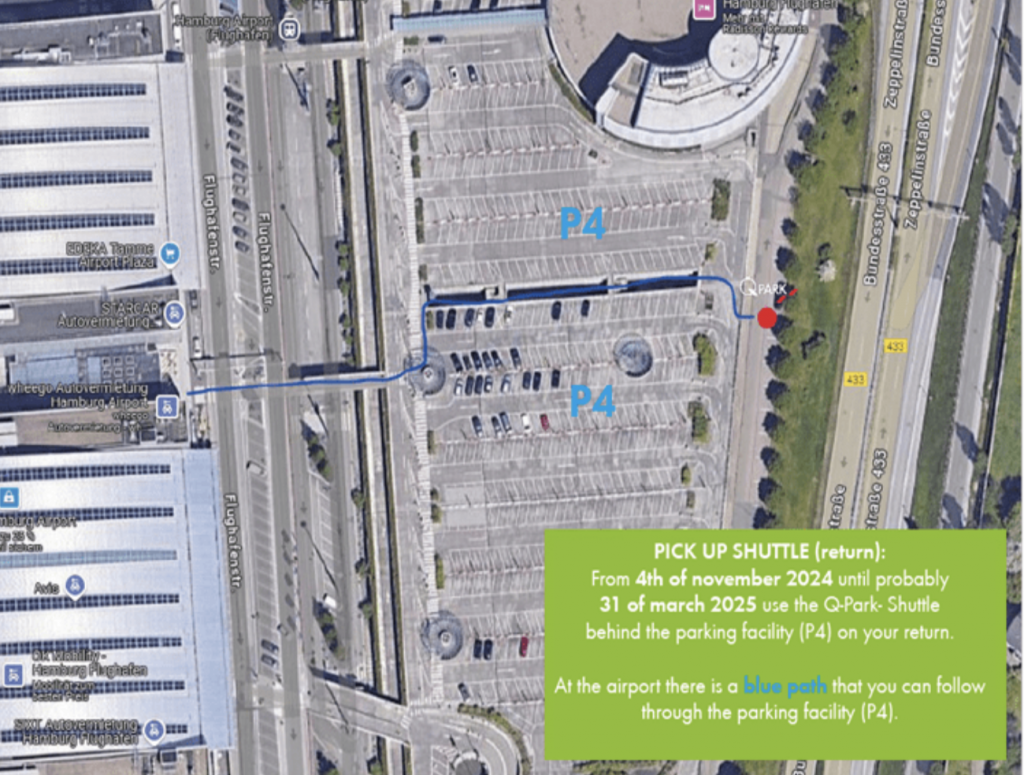 ->Die Haltestelle für die Rückfahrt vom Airport zum Holiday Parking Parkhaus befindet sich temporär (04.11.2024 - 31.03.2025) hinter dem Parkobjekt P4.
